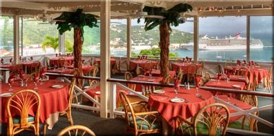 Overlooking Charlotte Amalie town and harbor, located at Bluebeard's Castle. You will be mesmerized by the panoramic views in this intimate restaurant. Sunsets to twinkling lights of downtown sparkle from each window. The menu is fresh seafood, steaks or pasta-but leave room for the desserts like Banana Mango Flambé or Flourless Chocolate Mousse Cake. Room with a View has, for several years in a row been awarded the Wine Spectator Award of Excellence.
